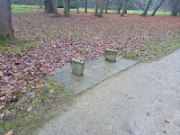 Vergleichsweise verwaschen und undeutlich kommt diese fotografische Aufnahme aus demselben Park mit dem Titel Nass-Au daher. In einer zielstrebigen Rinne wendet sich die Drusel vom Schloss Orangerie ab, als würde sie den Prunk und Protz des Adels verachten. Dabei ist sie doch selbst Teil ebendieses Prunks. Der Bach, an dieser Stelle eher als eine Art unnatürlich begradigter Bonsai-Kanal daherkommt, hatte ursprünglich eine völlig andere Form: Die Kleine Fulda, ein Arm der großen Fulda und immerhin halb so breit wie diese, umschloss das Parkgelände. Landgraf Moritz ließ sie noch gewähren, als er 1604 die Grundstücke erwarb und einen ersten Landschaftsgarten errichten ließ. Doch als Landgraf Karl diesen zum barocken Park umbaute, war es um die Kleine Fulda geschehen: Fortan durfte nur noch das wenige Wasser des Nebenflusses Drusel das Bett durchfließen. Im Zuge der Bundesgartenschau änderte sie ihre Gestalt noch einmal. Eine interessante Hintergrundgeschichte, doch erklärt sie nicht, warum das Bild so unscharf erscheint. Die Antwort verrät der dumpf-feuchte Farbton des Erdbodens: Es regnet viel zu viel. Mutiger kann Wetterkritik nicht sein.
